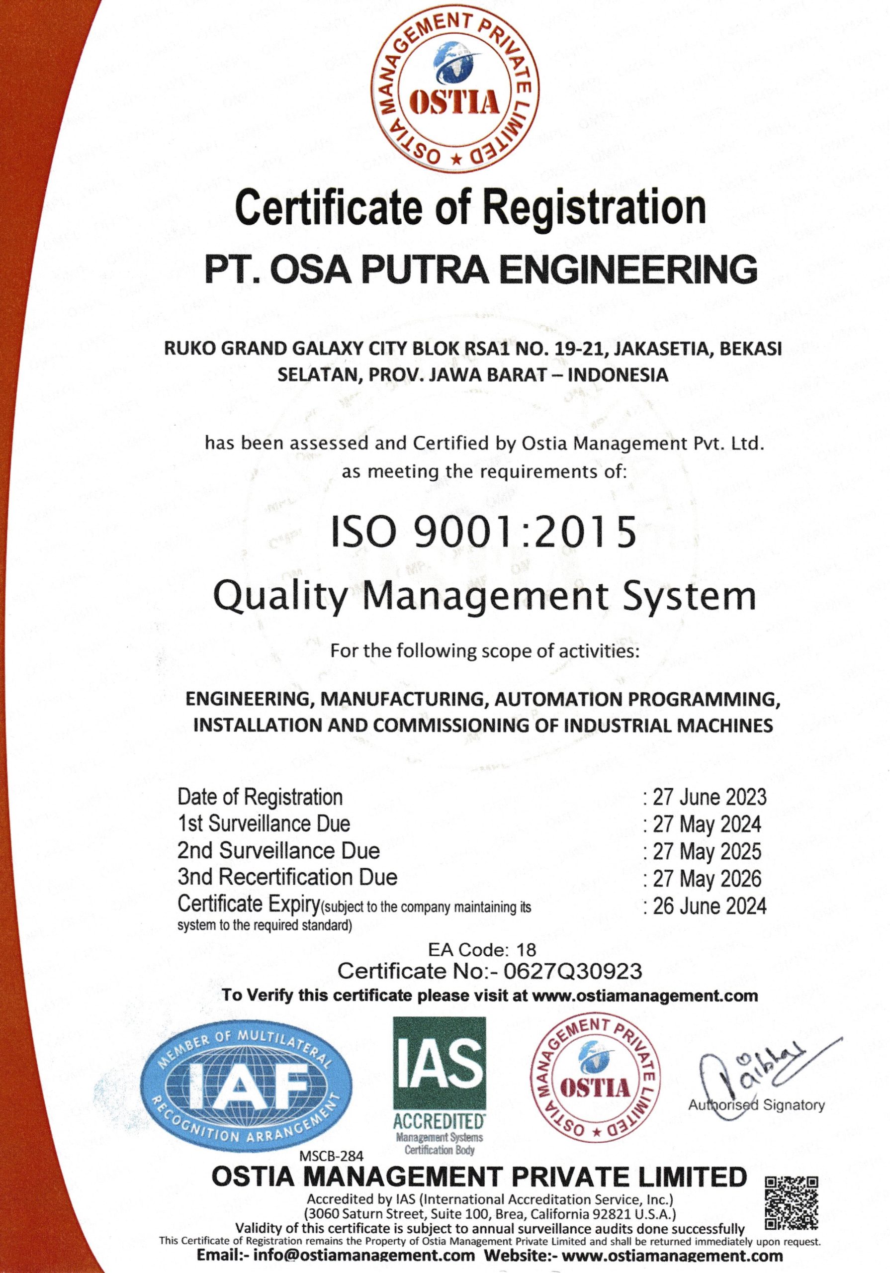 The Company has taken strategic steps in order to improve its performance and values in sustainable manner, including by employing international standards on internal systems. In the year of 2020, the Company receive ISO 9001:2015 certification